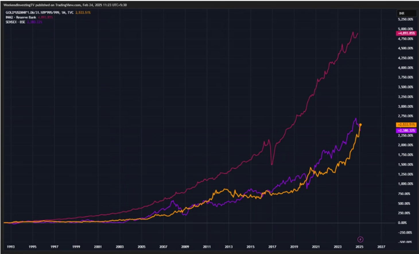 Money supply (maroon color) when compared to how gold (golden yellow color) and equity market (purple color) is performing should paint the picture